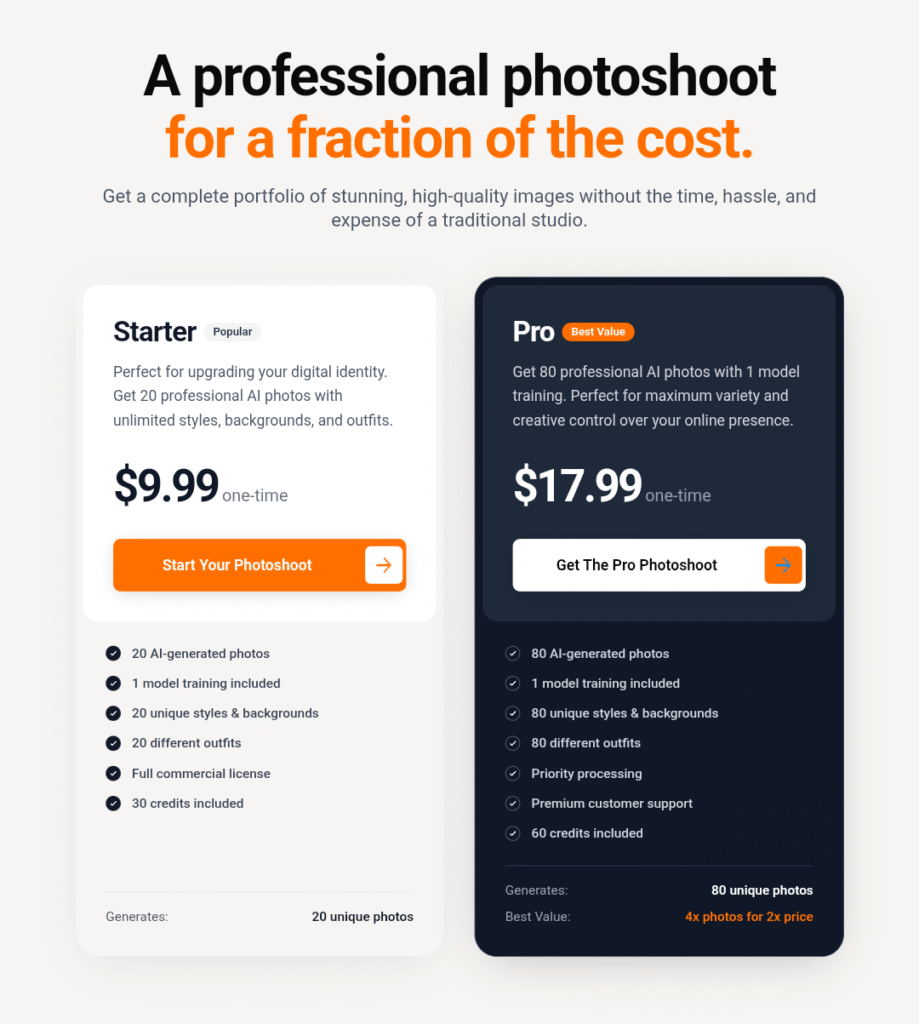 Pricing of unrealshot ai is decent and really worth for what they provide. I found unrealshot ai cheapest one among all the ai headshot generators in the market.