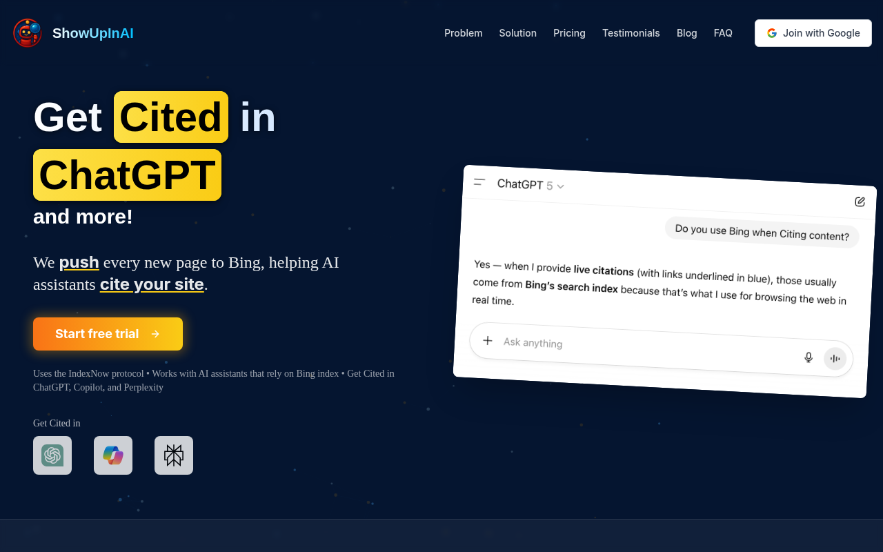- Without ShowUpInAI: You publish a new blog post. You wait 1-3 weeks for the Bing crawler to maybe find it.
